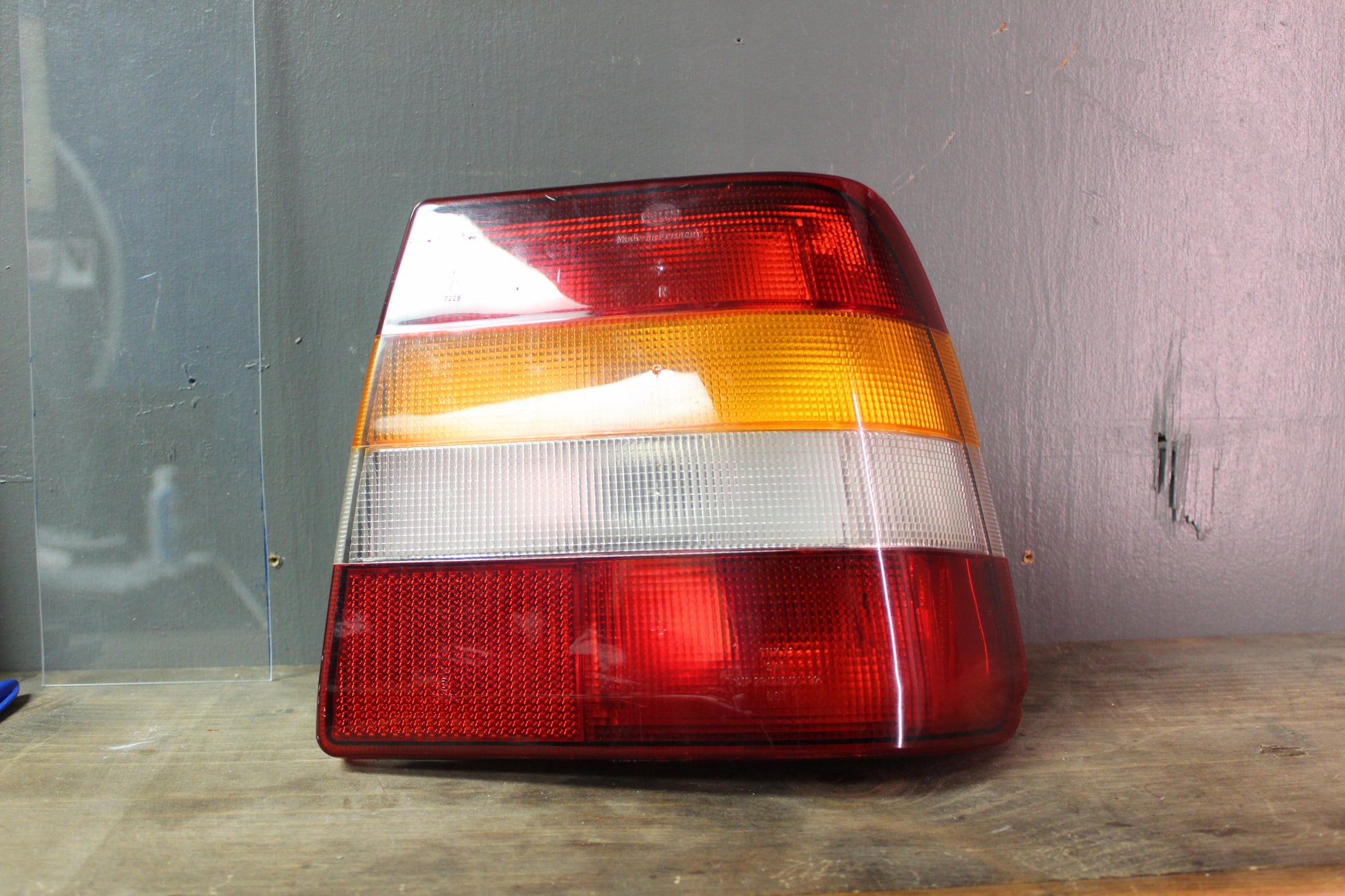 Right side (passenger's side) OEM Saab 9000 taillight assembly for some 4-door and 5-door models from 1985-1993. Please check your specific model to ensure compatibility. The item is a used, original equipment manufacturer (OEM) part with slight cracking/chipping on the edge of the lens. There is no visible rust or corrosion on the assembly. Any scratching or scuffing on the lens is minimal and not easily noticeable. This assembly includes the lens and housing, but does not include bulbs or wiring.